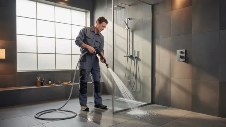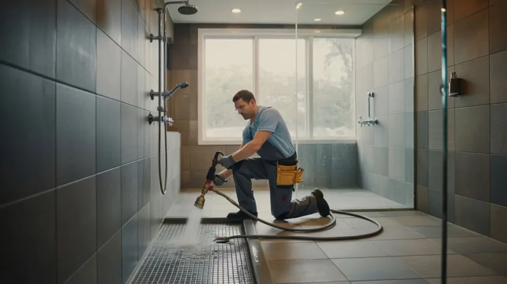 Professional plumber performing hydro jetting on a modern walk-in shower floor drain to remove deep clogs and buildup.